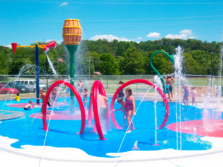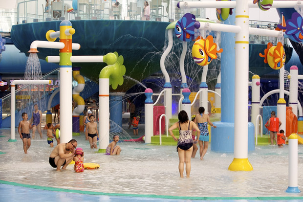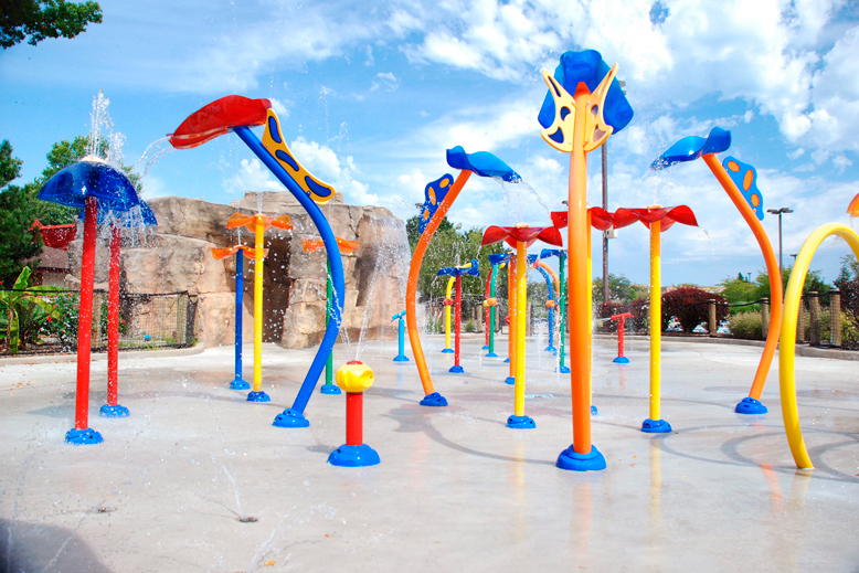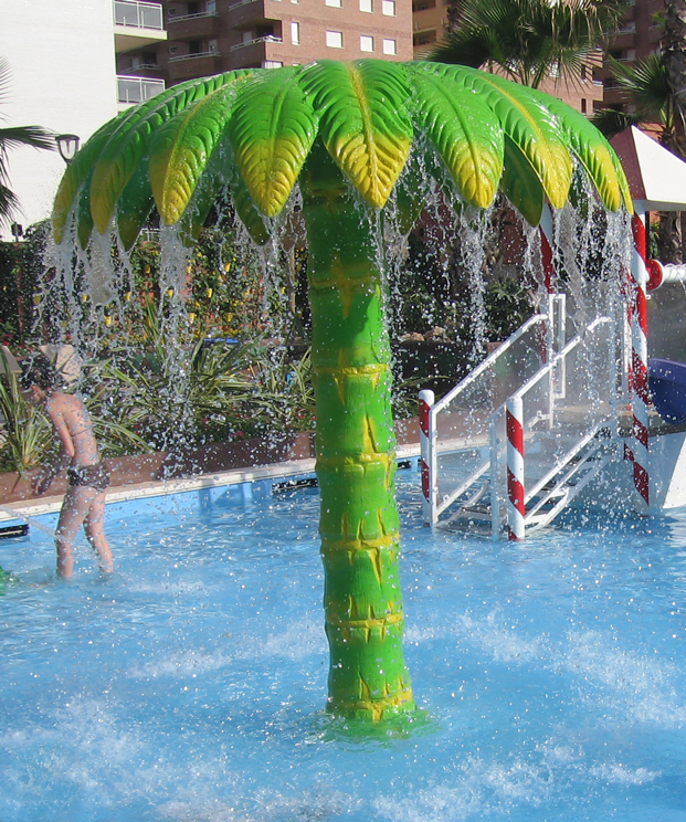 Así, ellos encontrarán gran diversión rodeados por vistosas figuras de cocodrilos, ranas, mariposa, palmeras rociadoras, campanas